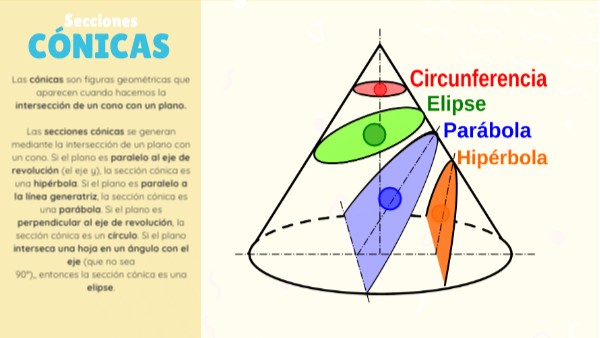 Las cónicas son figuras geométricas que aparecen cuando hacemos la intersección de un cono con un plano. Las secciones cónicas se generan mediante la intersección de un plano con un cono. Si el plano es paralelo al eje de revolución (el eje y), la sección cónica es una hipérbola. Si el plano es paralelo a la línea generatriz, la sección cónica es una parábola. Si el plano es perpendicular al eje de revolución, la sección cónica es un círculo. Si el plano interseca una hoja en un ángulo con el eje (que no sea 90°),, entonces la sección cónica es una elipse.
