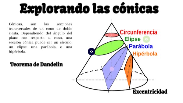 Cónicas, son las secciones transversales de un cono de doble siesta. Dependiendo del ángulo del plano con respecto al cono, una sección cónica puede ser un círculo, un elipse, una parábola, o una hipérbola.