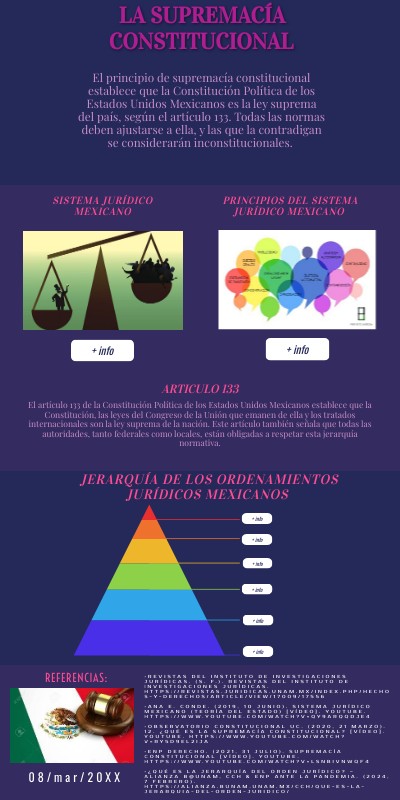 •Revistas del Instituto de Investigaciones Jurídicas. (s. f.). Revistas del Instituto de Investigaciones Jurídicas. https://revistas.juridicas.unam.mx/index.php/hechos-y-derechos/article/view/17009/17556 •Ana E. Conde. (2019, 10 junio). SISTEMA JURÍDICO MEXICANO (Teoría del Estado) [Vídeo]. YouTube. https://www.youtube.com/watch?v=qY9ArqQDJE4 •Observatorio Constitucional UC. (2020, 21 marzo). 12. ¿Qué es la Supremacía Constitucional? [Vídeo]. YouTube. https://www.youtube.com/watch?v=rY5D9eL2ijA •ENP Derecho. (2021, 31 julio). Supremacía constitucional [Vídeo]. YouTube. https://www.youtube.com/watch?v=lsNbiVNwqf4 •¿Qué es la Jerarquía del orden jurídico? – Alianza B@UNAM, CCH & ENP ante la pandemia. (2024, 7 febrero). https://alianza.bunam.unam.mx/cch/que-es-la-jerarquia-del-orden-juridico/