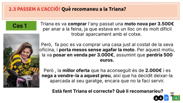 Triana es va comprar l'any passat una moto nova per 3.500€ per anar a la feina, ja que estava en un lloc on és molt difícil trobar aparcament amb el cotxe. Però, fa poc es va comprar una casa just al costat de la seva oficina, i porta mesos sense agafar la moto. Per aquest motiu, la va posar en venda per 3.000€, assumint que perdria 500 euros. Però , la millor oferta que ha aconseguit és de 2.000€ i es nega a vendre-la a aquest preu, així que ha decidit deixar-la aparcada al seu garatge, encara que no la faci servir. Està fent Triana el correcte? Què li recomanaríeu?