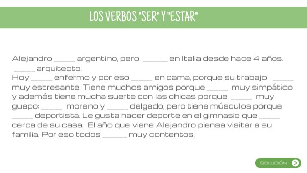Alejandro ______ argentino, pero _______ en Italia desde hace 4 años. ______ arquitecto. Hoy ______ enfermo y por eso ______ en cama, porque su trabajo ______ muy estresante. Tiene muchos amigos porque ______ muy simpático y además tiene mucha suerte con las chicas porque ______ muy guapo: ______ moreno y ______ delgado, pero tiene músculos porque ______ deportista. Le gusta hacer deporte en el gimnasio que ______ cerca de su casa. El año que viene Alejandro piensa visitar a su familia. Por eso todos _______ muy contentos.