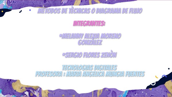 mètodos de tècnicas o diagrama de flujo integrantes: *melanny Alexia Moreno gonzàlez *SERGIO FLORES ZENÒN TECNOLOGIAS DIGITALES PROFESORA : mARIA angelica mungia fuentes