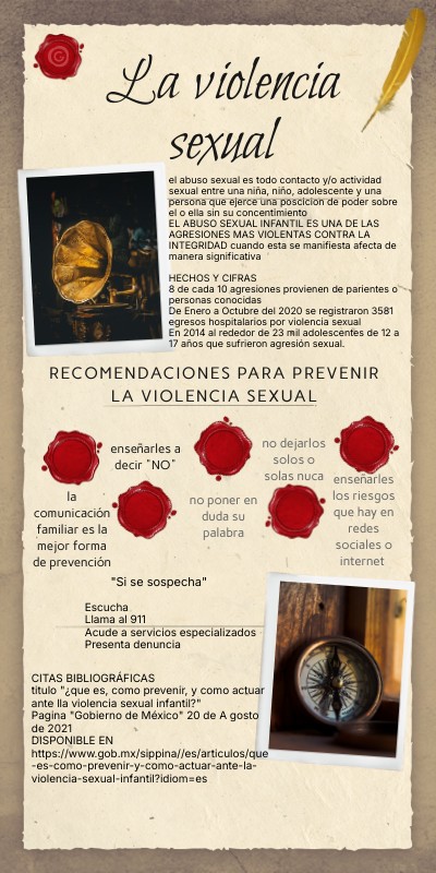 CITAS BIBLIOGRÁFICAS titulo "¿que es, como prevenir, y como actuar ante lla violencia sexual infantil?" Pagina "Gobierno de México" 20 de A gosto de 2021 DISPONIBLE EN https://www.gob.mx/sippina//es/articulos/que-es-como-prevenir-y-como-actuar-ante-la-violencia-sexual-infantil?idiom=es