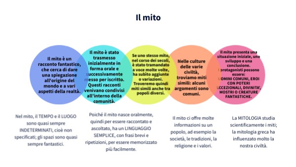 Il mito presenta una situazione iniziale, uno sviluppo e una conclusione.I protagonisti possono essere: UOMINI COMUNI, EROI CON POTERI ECCEZIONALI, DIVINITA', MOSTRI O CREATURE FANTASTICHE.