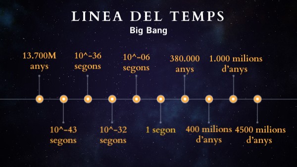 Big BangL’univers comença a expandir-se des d’un estat extremadament dens i calent (singularitat). No existien ni l’espai ni el temps abans.