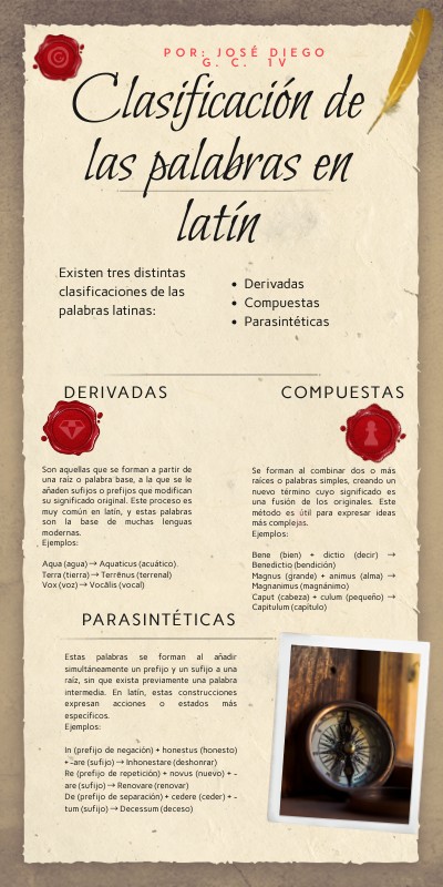 Se forman al combinar dos o más raíces o palabras simples, creando un nuevo término cuyo significado es una fusión de los originales. Este método es útil para expresar ideas más complejas.Ejemplos: Bene (bien) + dictio (decir) → Benedictio (bendición) Magnus (grande) + animus (alma) → Magnanimus (magnánimo) Caput (cabeza) + culum (pequeño) → Capitulum (capítulo)