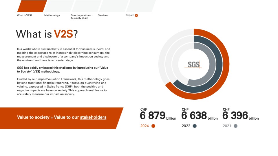 In a world where sustainability is essential for business survival and meeting the expectations of increasingly discerning consumers, the measurement and disclosure of a company's impact on society and the environment have taken center stage. SGS has boldly embraced this challenge by introducing our "Value to Society" (V2S) methodology. Guided by our Impact Valuation Framework, this methodology goes beyond traditional financial reporting. It focus on quantifying and valuing, expressed in Swiss francs (CHF), both the positive and negative impacts we have on society. This approach enables us to accurately measure our impact on society.