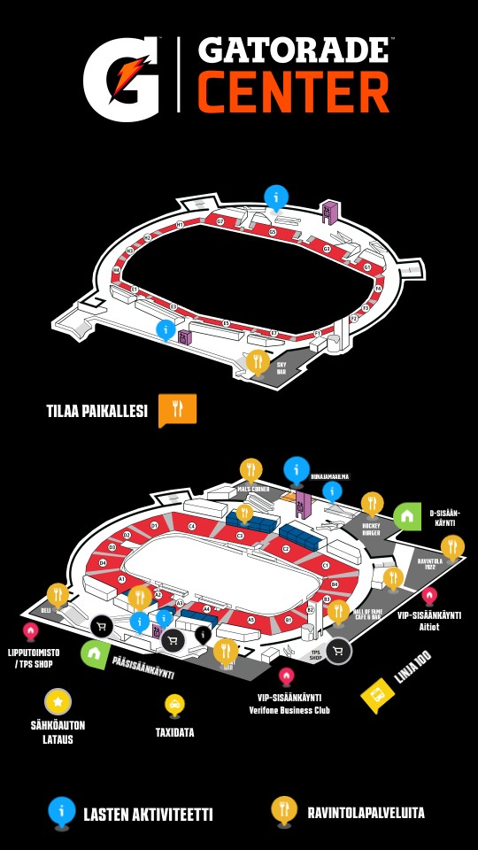 Voit tilata ruokaa, juomaa ja fanituotteita suoraan istuimellesi. Sovelluksen lataaminen on ilmaista, eikä tilatuista tuotteista veloiteta lisähintaa. Lataa TPS- tai Gatorade-sovellus matkapuhelimeesi App Storesta tai Google Play Kaupasta. Applikaation kautta voit tilata tuotteita kaikkiin katsomonosiin - katsomoravintolaan, yläkatsomoon ja jopa aitioihin.