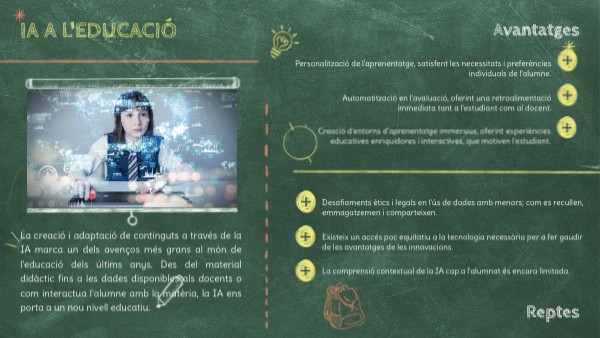 La creació i adaptació de continguts a través de la IA marca un dels avenços més grans al món de l'educació dels últims anys. Des del material didàctic fins a les dades disponibles als docents o com interactua l'alumne amb la matèria, la IA ens porta a un nou nivell educatiu.