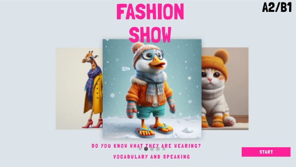 Activity 1 Explain to the ss that they will have 3 minutes to complete the task. The images of the animals in clothes are changing and students need to mark the words which correspond to the items of clothing they see. When they are done, they click check to see if they are correct. When the activity is done correctly another button appears which will show the images one by one. When the time finishes the images disappear. You can reactivate the images by clicking TRY AGAIN Activity 2 T shows the images individually asking students to describe what the animal is wearing. This is meant to activate the vocabulary which students revised before. Class activities - vocabulary * Put students into teams and tell them to write down the items they recognize. Check the items on the board to see if they are correct. * Put ss in teams and organize a tema race - which teams can name all the items correctly wins. * Individual practice - online ss - ask s to click the words themselves and then check Class activities - speaking / writing * Put ss into teams. Ask every ss to prepare a sentence about the clothes the animals are wearing. Tell them to use the words from the slide. Ask ss to say their sentence one by one. Tell them that the sentences cannot repeat. This will make ss think of a new idea every time. * Ask ss to work in groups and prepare a written description of a chosen image. Make it a competition - the more colorful description the better. * Click exclamation mark and show ss all the pictures at once - ask them to pick an image and either create an oral or a written description. Make sure that ss pick all the images.