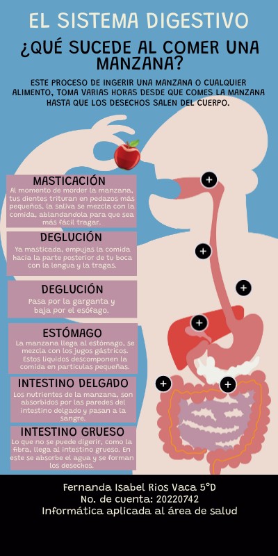 Este proceso de ingerir una manzana o cualquier alimento, toma varias horas desde que comes la manzana hasta que los desechos salen del cuerpo.