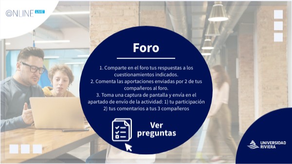 1. Comparte en el foro tus respuestas a los cuestionamientos indicados.2. Comenta las aportaciones enviadas por 2 de tus compañeros al foro. 3. Toma una captura de pantalla y envía en el apartado de envío de la actividad: 1) tu participación 2) tus comentarios a tus 3 compañeros