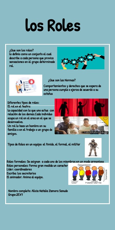 Roles formales: Se asignan a cada uno de los miembros en un modo armonioso Roles personales: Forma gran medida un caracter Lider: coordinadores Escriba: los secretarios El animador: Anima al equipo.