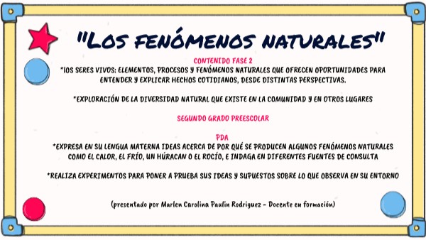 CONTENIDO FASE 2 *lOS SERES VIVOS: ELEMENTOS, PROCESOS Y FENÓMENOS NATURALES QUE OFRECEN OPORTUNIDADES PARA ENTENDER Y EXPLICAR HECHOS COTIDIANOS, DESDE DISTINTAS PERSPECTIVAS. *EXPLORACIÓN DE LA DIVERSIDAD NATURAL QUE EXISTE EN LA COMUNIDAD Y EN OTROS LUGARES SEGUNDO GRADO PREESCOLAR PDA *EXPRESA EN SU LENGUA MATERNA IDEAS ACERCA DE POR QUÉ SE PRODUCEN ALGUNOS FENÓMENOS NATURALES COMO EL CALOR, EL FRÍO, UN HÚRACAN O EL ROCÍO, E INDAGA EN DIFERENTES FUENTES DE CONSULTA *REALIZA EXPERIMENTOS PARA PONER A PRUEBA SUS IDEAS Y SUPUESTOS SOBRE LO QUE OBSERVA EN SU ENTORNO (presentado por Marlen Carolina Paulin Rodriguez - Docente en formación)