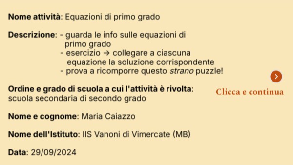 Nome attività: Equazioni di primo gradoDescrizione: - guarda le info sulle equazioni di primo grado - esercizio -> collegare a ciascuna equazione la soluzione corrispondente - prova a ricomporre questo strano puzzle! Ordine e grado di scuola a cui l'attività è rivolta: scuola secondaria di secondo grado Nome e cognome: Maria Caiazzo Nome dell'Istituto: IIS Vanoni di Vimercate (MB) Data: 29/09/2024