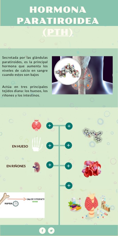 Secretada por las glándulas paratiroides, es la principal hormona que aumenta los niveles de calcio en sangre cuando estos son bajos Actúa en tres principales tejidos diana: los huesos, los riñones y los intestinos.