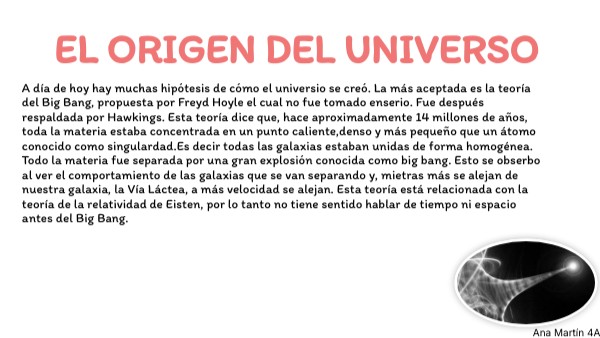 A día de hoy hay muchas hipótesis de cómo el universio se creó. La más aceptada es la teoría del Big Bang, propuesta por Freyd Hoyle el cual no fue tomado enserio. Fue después respaldada por Hawkings. Esta teoría dice que, hace aproximadamente 14 millones de años, toda la materia estaba concentrada en un punto caliente,denso y más pequeño que un átomo conocido como singulardad.Es decir todas las galaxias estaban unidas de forma homogénea. Todo la materia fue separada por una gran explosión conocida como big bang. Esto se obserbo al ver el comportamiento de las galaxias que se van separando y, mietras más se alejan de nuestra galaxia, la Vía Láctea, a más velocidad se alejan. Esta teoría está relacionada con la teoría de la relatividad de Eisten, por lo tanto no tiene sentido hablar de tiempo ni espacio antes del Big Bang.