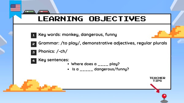 Key words: monkey, dangerous, funny Grammar: /to play/, demonstrative adjectives, regular plurals Phonics: /-ch/ Key sentences: