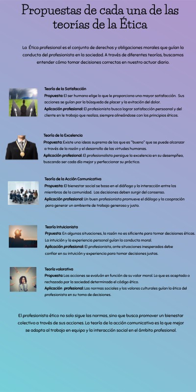 Teoría valorativa Propuesta: Las acciones se evaluán en función de su valor moral. Lo que es aceptado o rechazado por la sociedad determinada el código ético. Aplicación profesional: Las normas sociales y los valores culturales guían la ética del profesionista en su toma de decisiones.