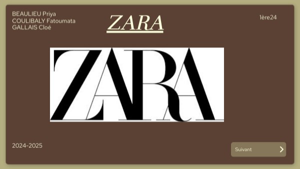 ZARA a été crée par Amancio Ortega Gaona et Rosalia Mera(entreprise familliale) il s'inspirer de grande marques françaises.Sa premiere boutique a été crée en 1975 à la Corogne en Galice au nord de l'Espagne, (appartient au groupe inditex avec bershka,Pull&Bear,Stradivarius). C'est une marque de fast-fashion qui produit des vetements à bas couts et qui réponds aux tendances et à la mode