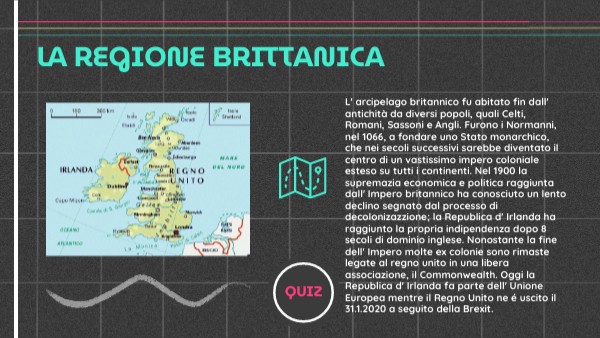 L' arcipelago britannico fu abitato fin dall' antichità da diversi popoli, quali Celti, Romani, Sassoni e Angli. Furono i Normanni, nel 1066, a fondare uno Stato monarchico, che nei secoli successivi sarebbe diventato il centro di un vastissimo impero coloniale esteso su tutti i continenti. Nel 1900 la supremazia economica e politica raggiunta dall' Impero britannico ha conosciuto un lento declino segnato dal processo di decolonizazzione; la Republica d' Irlanda ha raggiunto la propria indipendenza dopo 8 secoli di dominio inglese. Nonostante la fine dell' Impero molte ex colonie sono rimaste legate al regno unito in una libera associazione, il Commonwealth. Oggi la Republica d' Irlanda fa parte dell' Unione Europea mentre il Regno Unito ne é uscito il 31.1.2020 a seguito della Brexit.