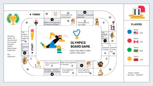 Choose a token, roll the dice and try to reach the goal before anyone else. Good luck! Mrs Vigouroux