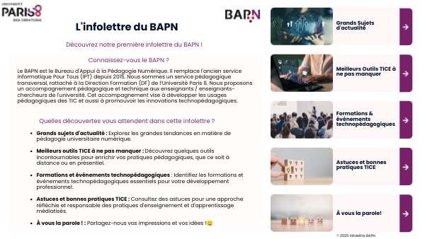 Le BAPN est le Bureau d'Appui à la Pédagogie Numérique. Il remplace l'ancien service Informatique Pour Tous (IPT) depuis 2015. Nous sommes un service pédagogique transversal, rattaché à la Direction Formation (DF) de l’Université Paris 8. Nous proposons un accompagnement pédagogique et technique aux enseignants / enseignants-chercheurs de l'université. Cet accompagnement vise à développer les usages pédagogiques des TIC et aussi à promouvoir les innovations technopédagogiques.