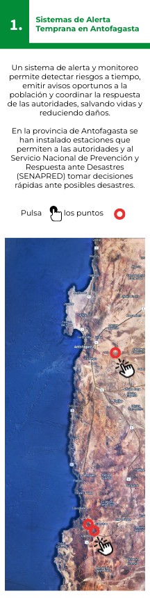 Un sistema de alerta y monitoreo permite detectar riesgos a tiempo, emitir avisos oportunos a la población y coordinar la respuesta de las autoridades, salvando vidas y reduciendo daños. En la provincia de Antofagasta se han instalado estaciones que permiten a las autoridades y al Servicio Nacional de Prevención y Respuesta ante Desastres (SENAPRED) tomar decisiones rápidas ante posibles desastres.