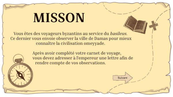 Vous êtes des voyageurs byzantins au service du basileus. Ce dernier vous envoie observer la ville de Damas pour mieux connaître la civilisation omeyyade. Après avoir complété votre carnet de voyage, vous devez adresser à l'empereur une lettre afin de rendre compte de vos observations.