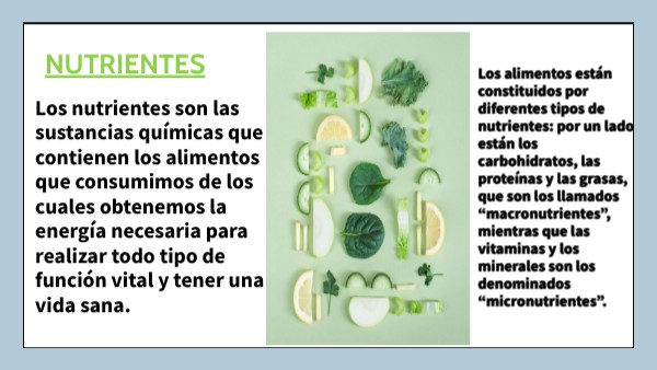 Los nutrientes son las sustancias químicas que contienen los alimentos que consumimos de los cuales obtenemos la energía necesaria para realizar todo tipo de función vital y tener una vida sana.