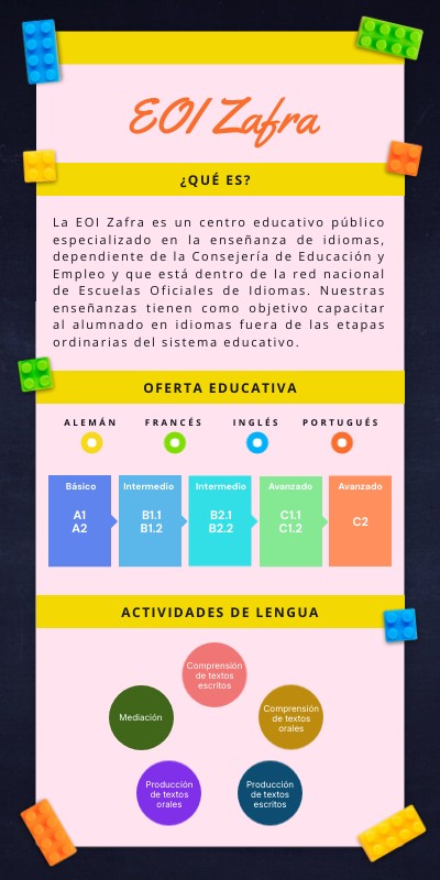 La EOI Zafra es un centro educativo público especializado en la enseñanza de idiomas, dependiente de la Consejería de Educación y Empleo y que está dentro de la red nacional de Escuelas Oficiales de Idiomas. Nuestras enseñanzas tienen como objetivo capacitar al alumnado en idiomas fuera de las etapas ordinarias del sistema educativo.