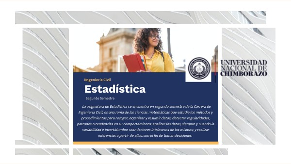 La asignatura de Estadística se encuentra en segundo semestre de la Carrera de Ingeniería Civil; es una rama de las ciencias matemáticas que estudia los métodos y procedimientos para recoger, organizar y resumir datos; detectar regularidades, patrones o tendencias en su comportamiento; analizar los datos, siempre y cuando la variabilidad e incertidumbre sean factores intrínsecos de los mismos; y realizar inferencias a partir de ellos, con el fin de tomar decisiones.