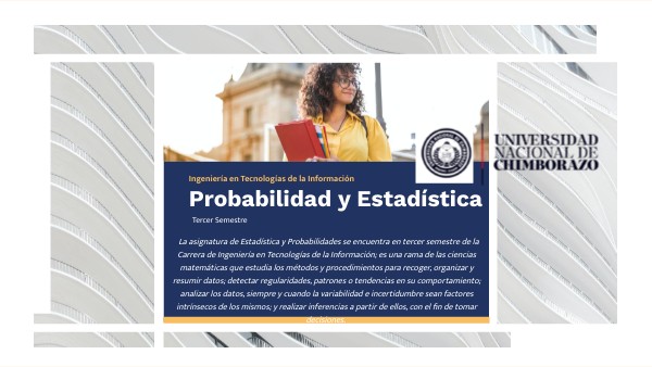 La asignatura de Estadística y Probabilidades se encuentra en tercer semestre de la Carrera de Ingeniería en Tecnologías de la Información; es una rama de las ciencias matemáticas que estudia los métodos y procedimientos para recoger, organizar y resumir datos; detectar regularidades, patrones o tendencias en su comportamiento; analizar los datos, siempre y cuando la variabilidad e incertidumbre sean factores intrínsecos de los mismos; y realizar inferencias a partir de ellos, con el fin de tomar decisiones.