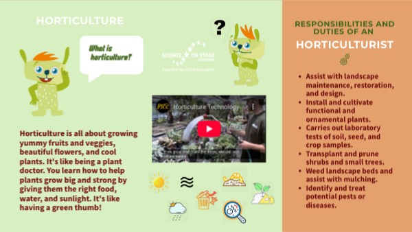 Horticulture is all about growing yummy fruits and veggies, beautiful flowers, and cool plants. It's like being a plant doctor. You learn how to help plants grow big and strong by giving them the right food, water, and sunlight. It's like having a green thumb!