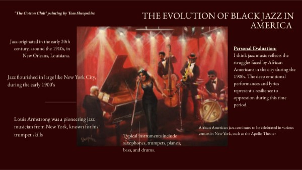 Personal Evaluation:I think jazz music reflects the struggles faced by African Americans in the city during the 1900s. The deep emotional performances and lyrics represent a resilience to oppression during this time period.