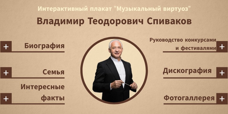Владимир Теодорович Спиваков родился 12 сентября 1944 года в Уфе. С 6 лет Володя начал учиться игре на скрипке у Б. Крюгера. В 13 лет юный скрипач впервые принял участие в конкурсе, где получил свою первую премию. Закончил Московскую консерваторию имени Чайковского, класс скрипки знаменитого Ю. Янкелевича. И уже в начале своей карьеры Володя становится лауреатом нескольких престижных Международных конкурсов скрипачей. В 1975 году Спиваков дебютировал в США. Его выход с камерной программой в Нью-Йорке произвел такой фурор, что даже после первого отделения зал встал. С этого началась его успешная международная карьера. В качестве скрипача-солиста он выступал со многими крупными дирижера22ми – Мравинским, Светлановым, Темиркановым, Ростроповичем, Бернстайном, Мути и другими, участвовал в различных камерных составах. Параллельно Владимир задумался о специальности дирижера, которой обучался у И. Гусмана, а при случае брал консультации у известнейших зарубежных дирижеров – Маазеля и Бернстайна. Еще одной сферой деятельности стало для Спивакова преподавание, в Музыкально-педагогическом институте имени Гнесиных он обучал студентов в течении почти 20 лет и получил ученое звания профессора. Год 1979-й стал особо знаменательным в творческой судьбе Спивакова – он блестяще дебютировал как дирижер и создал собственный коллектив, руководство которым принесло ему самую широкую мировую славу в течение десятков лет, – оркестр «Виртуозы Москвы». Помимо этого основал музыкальный фестиваль во Франции, учредил Международный благотворительный фонд В. Спивакова в Москве, стипендиатами которого стали многие одарённые юные музыканты… В настоящее время Владимир Теодорович руководит Государственным камерным оркестром «Виртуозы Москвы» и Национальным филармоническим оркестром России, является президентом Московского международного Дома музыки, членом жюри и участником международных конкурсов и концертов, членом Патриаршего совета по культуре (РПЦ). Известен он и своей благотворительной деятельностью. Владимир Спиваков – Народный артист СССР, лауреат российских и международных премий, полный кавалер ордена «За заслуги перед Отечеством» – удостоен титула «Посол Доброй воли ЮНЕСКО», награжден орденами и медалями России и других стран, почетный гражданин городов Кольмара и Тольятти. Жизни и творчеству Маэстро посвящено несколько книг и музыкальных произведений.