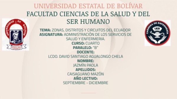 TEMA: ZONAS, DISTRITOS Y CIRCUITOS DEL ECUADOR ASIGNATURA: ADMINISTRACIÓN DE LOS SERVICIOS DE SALUD Y ENFERMERIA. CURSO: CUARTO PARALELO: “B” DOCENTE: LCDO. DAVID SANTIAGO AGUALONGO CHELA NOMBRE: JAZMÍN PAOLA APELLIDOS: CAISAGUANO MAZÓN AÑO LECTIVO: SEPTIEMBRE - DICIEMBRE