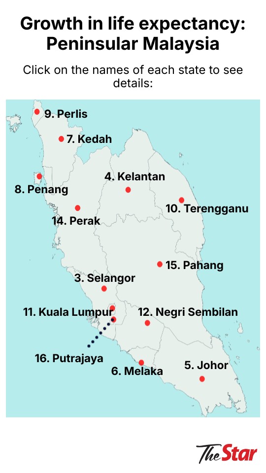 16. Putrajaya Life expectancy (2024): 74.5 Growth (2024 vs 2022): 0.3 years Life expectancy by gender Male: 72.3 Female: 76.5