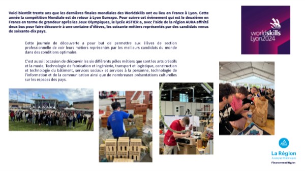 Voici bientôt trente ans que les dernières finales mondiales des Worldskills ont eu lieu en France à Lyon. Cette année la compétition Mondiale est de retour à Lyon Eurexpo. Pour suivre cet évènement qui est le deuxième en France en terme de grandeur après les Jeux Olympiques, le lycée ASTIER a, avec l’aide de la région AURA affrété deux bus pour faire découvrir à une centaine d’élèves, les soixante métiers représentés par des candidats venus de soixante-dix pays.