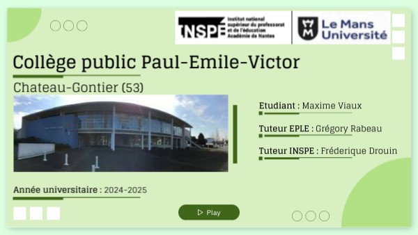 Situation géographique : Le collège Paul-Emile-Victor (PEV) est un établissement public situé à Chateau-Gontier-sur-Mayenne (16 710 habitants). Le collège accueille chaque année des élèves des communes environnantes.