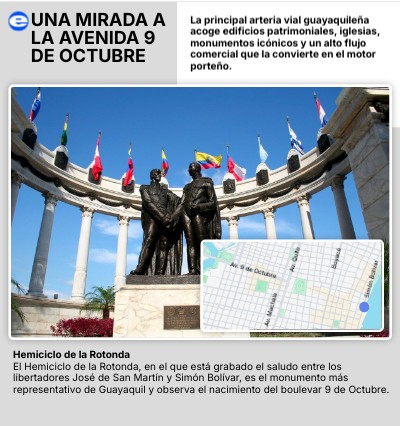 Hemiciclo de la Rotonda El Hemiciclo de la Rotonda, en el que está grabado el saludo entre los libertadores José de San Martín y Simón Bolívar, es el monumento más representativo de Guayaquil y observa el nacimiento del boulevar 9 de Octubre.
