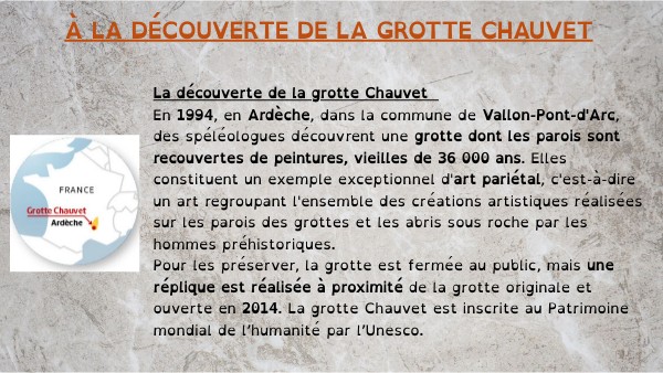 La découverte de la grotte Chauvet En 1994, en Ardèche, dans la commune de Vallon-Pont-d'Arc, des spéléologues découvrent une grotte dont les parois sont recouvertes de peintures, vieilles de 36 000 ans. Elles constituent un exemple exceptionnel d'art pariétal, c'est-à-dire un art regroupant l'ensemble des créations artistiques réalisées sur les parois des grottes et les abris sous roche par les hommes préhistoriques. Pour les préserver, la grotte est fermée au public, mais une réplique est réalisée à proximité de la grotte originale et ouverte en 2014. La grotte Chauvet est inscrite au Patrimoine mondial de l’humanité par l’Unesco.