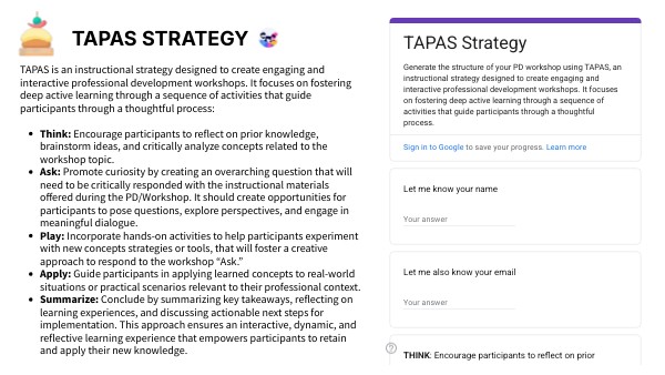 TAPAS is an instructional strategy designed to create engaging and interactive professional development workshops. It focuses on fostering deep active learning through a sequence of activities that guide participants through a thoughtful process: