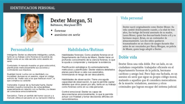 Habilidades forenses: Como analista forense en el Departamento de Policía de Miami, Dexter tiene un profundo conocimiento de la ciencia forense, lo que le ayuda a comprender y manipular la evidencia. Planificación estratégica: Es extremadamente meticuloso y planificador. Dexter elabora detallados planes para llevar a cabo sus asesinatos, minimizando el riesgo de ser descubierto. Habilidades de observación: Tiene una aguda capacidad de observación, lo que le permite captar detalles que otros pasan por alto, tanto en su trabajo como forense como en su vida personal. Control emocional: Dexter es capaz de desconectarse emocionalmente, lo que le permite actuar con frialdad y tomar decisiones difíciles sin remordimientos.