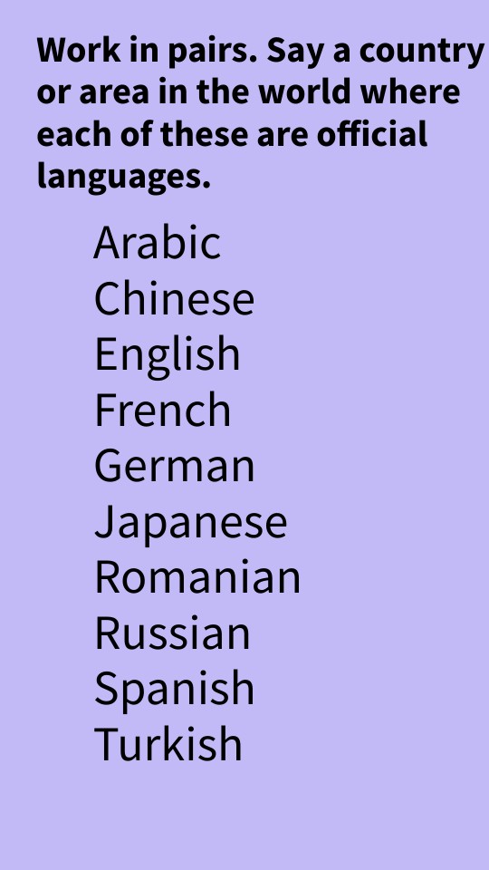 Work in pairs. Say a country or area in the world where each of these are official languages.