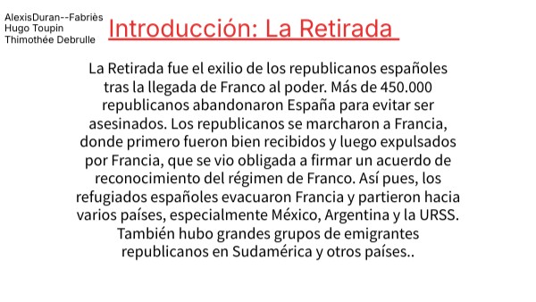 La Retirada fue el exilio de los republicanos españoles tras la llegada de Franco al poder. Más de 450.000 republicanos abandonaron España para evitar ser asesinados. Los republicanos se marcharon a Francia, donde primero fueron bien recibidos y luego expulsados por Francia, que se vio obligada a firmar un acuerdo de reconocimiento del régimen de Franco. Así pues, los refugiados españoles evacuaron Francia y partieron hacia varios países, especialmente México, Argentina y la URSS. También hubo grandes grupos de emigrantes republicanos en Sudamérica y otros países..