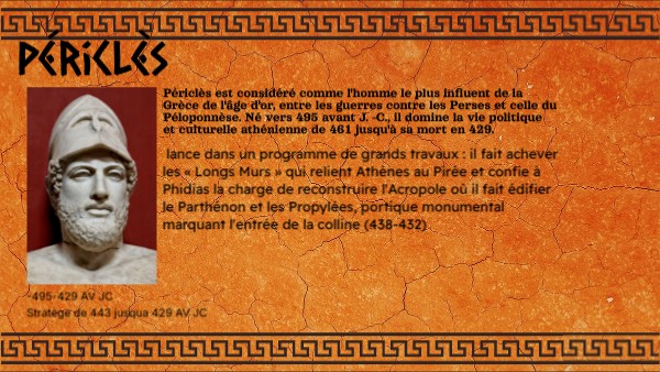 Périclès est considéré comme l'homme le plus influent de la Grèce de l'âge d'or, entre les guerres contre les Perses et celle du Péloponnèse. Né vers 495 avant J. -C., il domine la vie politique et culturelle athénienne de 461 jusqu'à sa mort en 429.