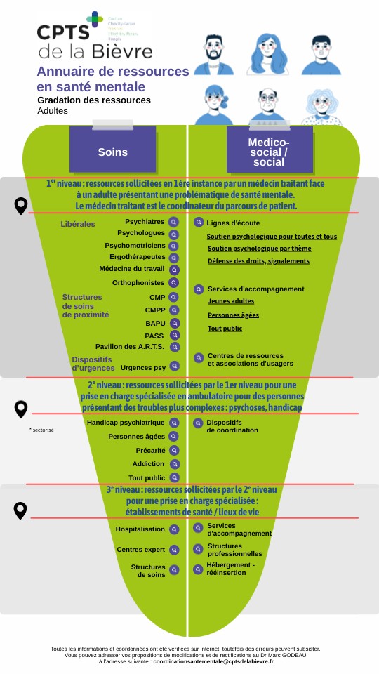 Toutes les informations et coordonnées ont été vérifiées sur internet, toutefois des erreurs peuvent subsister. Vous pouvez adresser vos propositions de modifications et de rectifications au Dr Marc GODEAU à l’adresse suivante : coordinationsantementale@cptsdelabievre.fr
