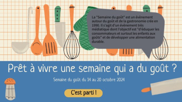 La "Semaine du goût" est un évènement autour du goût et de la gastronomie crée en 1990. Il s'agit d'un évènement très médiatique dont l'objectif est "d'éduquer les consommateurs et surtout les enfants aux goûts" et de développer une alimentation durable.