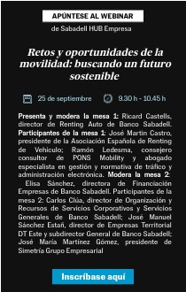 Presenta y modera la mesa 1: Ricard Castells, director de Renting Auto de Banco Sabadell. Participantes de la mesa 1: José Martin Castro, presidente de la Asociación Española de Renting de Vehículo; Ramón Ledesma, consejero consultor de PONS Mobility y abogado especialista en gestión y normativa de tráfico y administración electrónica. Modera la mesa 2: Elisa Sánchez, directora de Financiación Empresas de Banco Sabadell. Participantes de la mesa 2: Carlos Clúa, director de Organización y Recursos de Servicios Corporativos y Servicios Generales de Banco Sabadell; José Manuel Sánchez Estañ, director de Empresas Territorial DT Este y subdirector General de Banco Sabadell; José María Martínez Gómez, presidente de Simetría Grupo Empresarial